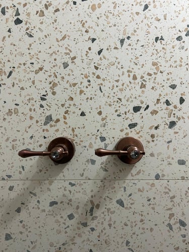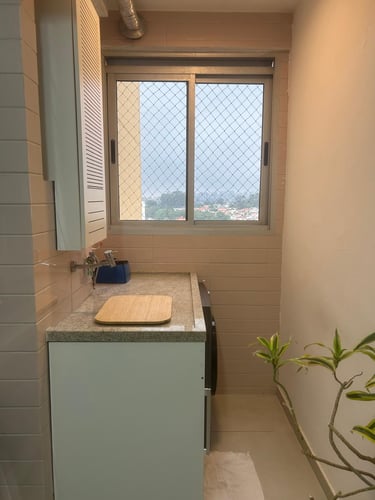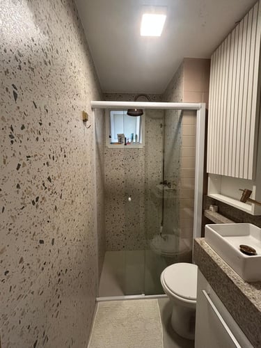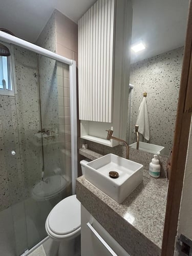Com a restrição de não poder quebrar paredes e um prazo enxuto de um mês, trabalhamos soluções inteligentes por meio de materiais, texturas e cores. A paleta em tons pastel, combinada a pedras e porcelanatos atemporais, trouxe leveza sem perder profundidade.
