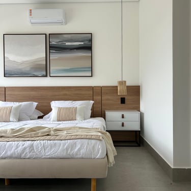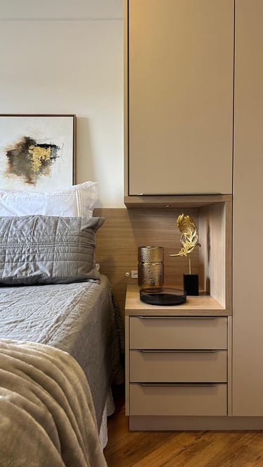Como o apartamento já tinha uma base neutra e bem acabada, foquei em criar soluções atemporais, com móveis planejados na medida certa e uma paleta leve em tons de madeira e cores suaves. A intenção foi manter amplitude, circulação confortável e um visual clean.