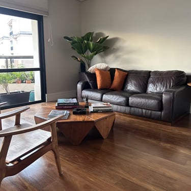 Sem reformas estruturais, o foco esteve na curadoria de mobiliário, tapetes, cortinas, objetos decorativos e iluminação. A escolha de materiais como madeira, couro e texturas atemporais trouxe profundidade, elegância e unidade ao espaço.