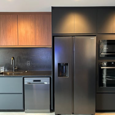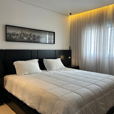 Com o apartamento totalmente reformado, transformamos a planta original em uma área social ampla e integrada, com apenas uma suíte. A paleta mais escura, materiais de diferentes texturas e uma estética minimalista criaram uma atmosfera intimista e elegante.